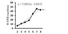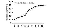 図2は、ADSCにおいて、不織布を足場とする培養における糖消費量と培養時間の関係である。図2に示すように、プロット値から、近似線y=7.0952x-3.8571であり、Day8での糖消費量はプラトー状態であることが確認できた。  FIG. 2 shows the relationship between sugar consumption and culturing time in culturing using a non-woven fabric as a scaffold in ADSC. As shown in FIG. 2, from the plot values, the approximate line y = 7.0952x-3.8571, and it was confirmed that the sugar consumption on