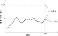 上記の比率が算出された後には、推定部24が上記の比率に基づき推定対象時点のラジオ聴取者数を放送局別に推定する。詳しく説明すると、推定部24は、取得した第二データが示すIPサイマルラジオのユニークユーザ数のうち、推定対象時点におけるユニークユーザ数に、算出した比率のうち、推定対象時点の時刻に対応する比率を乗じる。これにより、推定対象時点におけるラジオ聴取者数を推定することができる。具体例を挙げて説明すると、ある放送局Aについて、ある日におけるIPサイマルラジオの利用者数が図10に図示のグラフのように変化したとする。推定部24は、ある日の19時における放送局Aのラジオ聴取者数を推定するとき、同じ時刻のIPサイマルラジオのユニークユーザ数(図10中、記号Pにて示す)に、放送局A局について算出した19時の比率αを乗じる。このようにして算出された人数(=α×P)が、ある日の19時における放送局A局のラジオ聴取者数の推定結果に該当する。  After the above ratio is calculated, the