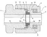 各締過ぎ防止用環状突起(9)(10)は、円環状シール突起(7)(8)よりも左右方向ガスケット(3)側に突出させられており、適正な締付けよりもさらに締付けようとしたさいに、リテーナ(5)をその両面から押圧するようになされている。 The annular protrusions (9) and (10) for preventing overtightening are projected toward the gasket (3) in the left-right direction from the annular seal protrusions (7) and (8), so that the tightening is more than proper tightening. At that time, the retainer (5) is pressed from both sides thereof.