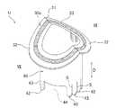 図2に示す平面視形状において、山型パッド30は例えば略円形であり、山形パッド30の外形サイズ(方向によって寸法が異なる場合には最大寸法)は、例えば5〜12cmであり、開口部30aの外形サイズ(方向によって寸法が異なる場合には最大寸法)は、例えば3〜8cmである。山型パッド30の厚さ(肉厚)は、例えば1〜8mmである。一対の傾斜面部32がなす角度α(図7に示す)は、例えば60°〜150°である。  In the plan view shape shown in FIG. 2, the