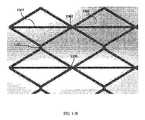 図13A〜図13Fは、双安定性ばねバンド構成を有するステント要素の実施形態を例示している。図13A〜図13Fには菱形構成を備えたセルが描かれているが、セルは、任意のクローズドセル構成を有し得る。図13Aは、双安定性ばねバンド構成を有する要素の2次元図である。図13Bは、図13Aのセルの拡大図である。図13Cは、図13Aのセルの斜視図である。図13Dは、双安定性ストラット1303の湾曲を示す図13Cのセルの断面図である。図13Eは、図13Dの双安定性ストラット1303の拡大図である。図13Fは、断面で示す双安定性ストラット1303の代替図である。図13Aのセル構造を備えたステント要素は、円筒を形成するための左から右への丸める向きを有する。この実施形態において、要素1300は、混ぜ合わされた双安定性セル1301及び非双安定性セル1302を備える。双安定性セル1301は、繰り返しパターンで長手方向及び/又は円周方向に整合されてもよい。同様に、非双安定性セル1302は、繰り返しパターンで長手方向及び/又は円周方向に整合されてもよい。追加的又は代替的に、非双安定性セル1302及び双安定性セル1301は、交互のパターンで螺旋状に整合されてもよい。実施形態において、非双安定性セル1302及び双安定性セル1301は、円周方向にオフセットされる。追加的に、非双安定性セル1302は、隣り合う4つの双安定性セル1301間の中心位置に形成されてもよい。図13A〜図13Fに例示する実施形態において、双安定性セル1301は、非双安定性セル1302と同じか又は類似の大きさを有し得る。代替的に、双安定性セル1301は、非双安定性セル1302よりも大きいか又は小さくてもよい。長手方向に整合された隣り合う双安定性セル1301は、長手方向連結ストラット1305により連結されてもよい。円周方向に整合された隣り合う双安定性セル1301は、円周方向連結ストラット1306により接続されてもよい。実施形態において、長手方向連結ストラット1305は、円周方向連結ストラット1306よりも大きな長さ又は幅を有し得る。代替的に、長手方向連結ストラット1305は、円周方向連結ストラット1306と同じ長さ又は幅を有し得る。双安定性セル1301は、円周方向に整合された双安定性ストラット1303を備える。双安定性ストラット1303は、双安定性ばねバンド構成を有する。実施形態において、双安定性ストラット1303は、凹凸形状を有する。双安定性ストラット1303は、真っ直ぐな形態か又は双安定性ストラット1303が凹方向に湾曲する湾曲形態をとってもよい。真っ直ぐな形態にある双安定性ストラット1303の剛性は、要素1300の半径方向の強度を増加させる。図13C〜図13Fに描かれているように、双安定性ストラット1303の凹曲線は長手方向に向けられ、且つ円筒要素1300の近位開口又は遠位開口に面する。要素1300は、拡張前のバルーンに装着されたときに圧着形態をとってもよい。同じように、要素1300は、バルーンにより拡張されたときに拡張形態をとってもよい。双安定性ストラット1303は、圧着形態では湾曲構成を有する。拡張状態では、双安定性ストラットは、真っ直ぐな構成を有する。  13A-13F illustrate embodiments of stent elements with a bistable spring band configuration. Although cells with a diamond configuration are depicted in FIGS. 13A-13F, the cells may have any closed cell configuration. FIG. 13A is a two-dimensional view of an element having a bistable spring band configuration. FIG. 13B is an enlarged view of the cell of FIG. 13A. 13C is a perspective view of the cell of FIG. 13A. FIG. 13D is a cross-sectional view of the cell of FIG. 13C showing the curvature of the