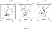 図13を参照すると、画面1301は、ユーザが自分の車に接近したときにユーザの車のロックを解除するためのアイコン1302を示している。機器100とユーザの近くの車との間の距離の減少に基づいて、機器100は、アイコン1302を表示することができる。任意選択的に、画面1301は、図1に関連して説明したものなどの、付加的な関連するアイコンを含むことができる。ユーザが自分の車の中にいる間に、機器100は、視聴位置に持ち上げられた場合、ユーザインターフェース画面1311を表示することができる。画面1311は、仕事場までの到着推定時間(「ETA」)(即ち、アイコン1312)、ユーザのカレンダに記載された次の会議までの時間(即ち、アイコン1313)、及び音楽プレーヤ(即ち、アイコン1314により表されるような)、に関する情報が含まれる。これらは、ユーザが仕事場に向かう途中で、ユーザに関連するものである。機器100は、GPSの移動に基づいて、及び/又は、車載テレマティックスシステム(例えば、Bluetooth(登録商標)又はケーブル接続による)との通信によって、ユーザは運転中であると判断することができる。機器100は、ユーザの通勤パターンに関する履歴情報に基づいて、ユーザは仕事場へ運転中であると判断することができる。ユーザが職場に近づくにつれて、到着推定時間の関連性はより少なくなり、その情報はより低い重要度で表示されることになる。例えば、ユーザインターフェース画面1321には、音楽アイコン1322は、ETAアイコン1324より大きいフォーマットで表示されている。カレンダに記載された次の会議までの時間の情報は、関連性が高いままなので、アイコン1323は、この時間を表示し続けることができる。会議がオフサイト(即ち、ユーザの仕事場から物理的に遠い)である場合、機器100は、GPSセンサ及びカレンダ情報に基づいて、関連性が高いとしてリマインダをマークすることができる。  Referring to FIG. 13,
