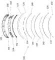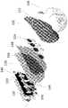 図6は、患者係合基板上に予め形成された湾曲を形成する装置180及び工程を例示する。図6は、下部患者係合基板104の部品を例示するが、同様の工程が、本明細書に記載された患者係合基板及び部品のいずれにも使用できる。装置180は、典型的な人間の胴体の湾曲を模倣するように設計された湾曲を有する曲面182を含む。装置180はまた、患者係合基板の部品を曲面182の湾曲に順応させる為に、患者係合基板の部品に圧力を加えるように構成されたローラ184を含む。例示された下部患者係合基板104は、複数の接着剤接合層140a、148b及び148cを含む。接着剤接合層は、シャーシ層148及び除細動器電極パッド140のように、結合している層と調和する複数の開口部を有する。シャーシ層148は、ハウジングの為の構造リングを含む。例示された下部患者係合基板104は、除細動器電極パッド140を有する複数層の除細動器電極形態を含む。フレキシブル回路144は、図6に示されないが、流体輸送要素142及び支持シャーシ148の間、又は患者係合基板の他の層の間に含まれても良い。患者係合基板は、装置180上の層毎に構築され得る。ローラ184は、各個別の層が加えられる時に、そこに湾曲を適用する為に使用でき、且つ/又はそれは、組み立てられた患者係合基板104に湾曲を適用する為に使用できる。装置180は、それらが、胴体のような患者の構造に対する患者係合基板の快適さを改善できる残留応力を有せるように、予め形成された湾曲を患者係合基板に適用する為に使用できる。  FIG. 6 illustrates an