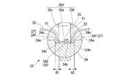 図11に示すとおり、第一把持部材24の溝部24bの第一内壁面24cと第二把持部材25の外周面25dの一部である第二側面25cとの間には第一の隙間61(隙間)が形成されている。同様にして、第一把持部材24の溝部24bの第二内壁面124cと第二把持部材25の外周面25dの一部である第一側面25bとの間には第二の隙間62が形成されている。第一の隙間61および第二の隙間62のそれぞれは、縫合糸50の直径よりも大きい。  As shown in FIG. 11, there is a