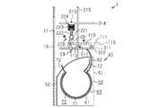 本体蓋52の機能は第1の開口51Aを開放または閉鎖することである。本体蓋52は例えば複数の角柱が屈曲可能に連続して並べられたシート形状を有する。本体蓋52はハウジング51に対してスライド可能にハウジング51に取り付けられる。具体的には、ハウジング51に形成された一対のレール(図示略)に本体蓋52の角柱の両端部が支持されている。本体蓋52がレールに沿ってスライドするように制御されることにより、第1の開口51Aが開放または閉鎖される。なお、図3は本体蓋52により第1の開口51Aが閉鎖されている状態を示している。  The function of themain body lid 52 is to open or close thefirst opening 51A. Themain body lid 52 has, for example, a sheet shape in which a plurality of prisms are continuously arranged so as to be bendable. Themain body lid 52 is slidably attached to thehousing 51 with respect to thehousing 51. Specifically, both ends of the prism of themain body lid 52 are supported by a pair of rails (not shown) formed in thehousing 51. By controlling themain body lid 52 to slide along the rail, thefirst opening 51A is opened or closed. Note that FIG. 3 shows a state in which thefirst opening 51A is closed by themain body lid 52.