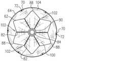 図6は、本発明の一実施形態に基づく、内側及び外側バルーンが膨張状態にある末端部材36の概略横断面図である。膨張モジュール78が、膨張流体100を内側バルーンに搬送することによって内側バルーン62を膨らませると、スプライン82が内側バルーンの膨張を拘束することによって、灌流導管66から灌流噴射口72に灌流液104を方向付ける通路102を形成するローブ88を形成する(すなわち各ローブ間の長手方向軸86に沿って)。  FIG. 6 is a schematic cross-sectional view of the