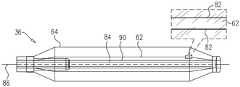 スプライン82は、楕円(例えば円形)又は長方形(平坦に見える場合がある)の断面を有してよく、一般的には可撓性の弾性材料(例えばニチノールとしても知られるニッケルチタンなどの形状記憶合金)で構成される。特定の実施形態では、スプライン82は内側バルーンの弾性材料内に埋め込まれてもよく、また、代替的な実施形態では、スプラインは、内側バルーンの外側表面に貼着する(すなわち図4に示される内側バルーンと外側バルーンとの間)か、又は内側バルーンの内側表面に貼着する(すなわち内側バルーンとスリーブ90との間)ことができる。内側バルーン62が膨らんでいない場合、スプライン82は真っ直ぐな状態(すなわち、スプラインの(元の状態))を保つことで内側バルーンを伸長状態に維持し、内側バルーン62が膨らむと各スプラインの長方形の形状のためにスプラインは一方向(すなわち、長手方向軸86から外側に)に曲がるように拘束される。スプライン82の形状記憶合金は、内側バルーン62が膨らんでいない場合に末端部材36を「真っ直ぐにする」ことに加えて、挿入管30を操作する際に行われる誤動作によって末端部材が「捻れ」て故障することを防止する。  The
