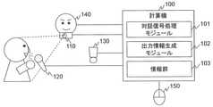 計算機100は、対話信号を用いて出力情報216(図2参照)を生成し、出力情報216に基づいて対話出力装置130、140を制御する。計算機100には、マウス、キーボード、タッチパネル等の入力装置150が接続される。  The