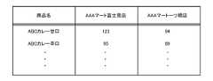 図50は、販売ポテンシャル情報の例を示す。ここでは、ポテンシャル情報生成部638は、「AAAマート富士見店」の「ABCカレー甘口」の販売ポテンシャル値として、図49の「東京都千代田区富士見(1)」と「東京都千代田区富士見(2)」の販売ポテンシャル値の合計である「123」を算出する。また、「AAAマート一ツ橋店」の「ABCカレー甘口」の販売ポテンシャル値として、図49の「東京都千代田区一ツ橋(1)」と「東京都千代田区一ツ橋(2)」の販売ポテンシャル値の合計である「94」を算出する。  FIG. 50 shows an example of sales potential information. Here, the potential