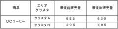 販売促進施策による効果を分析する従来の方法では、販促対象商品の販売量が総数として増加したことはわかるものの、どんな特徴を持つ消費者への販売量が増加したのかはわからなかった。したがって、販売促進施策が、そのターゲットとする顧客層に訴求するものであったか否かもわからなかった。販促効果分析部50によれば、デモグラフィック属性やサイコグラフィック属性等の様々な観点からの顧客像と対応づけられたエリアクラスタごとに販売促進施策による効果を算出できる。  With the conventional method of analyzing the effects of sales promotion measures, it is clear that the total sales volume of the products to be promoted has increased, but it is not clear what characteristics the sales volume to consumers has increased. Therefore, it was not clear whether the sales promotion measures appealed to the target customer base. According to the sales promotion
