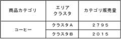 クラスタ販売量算出部44は、エリアクラスタ情報保持部22にアクセスしてエリアクラスタ情報を参照する。そして、エリアクラスタと商品との組み合わせごとに、エリア販売量を集計して、エリアクラスタにおける商品の所定期間における販売量(以下、「クラスタ販売量」と呼ぶ。)を算出する。図12は、クラスタ販売量算出部44により算出されたクラスタ販売量を示す。同図のクラスタ販売量は、図11に示すエリア販売量を商品ごとエリアクラスタごとに集計したものである。図6に戻る。  The cluster sales