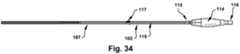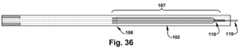 多枝型清掃部材107を駆動する場合、分枝109がそれらのそれぞれの内腔105から完全に引き抜かれるほどまで多枝型清掃部材107が後退されないことが好ましい。なぜなら、チューブ102が患者内に挿入されている臨床的状況では、分枝109を再び位置合わせしてそれぞれの内腔105内に挿入することが困難、おそらくは不可能になり、また、チューブ内のマルチルーメン領域の可視化が不可能になるか又は妨害され得るからである。代替的には、マルチルーメン領域を可視化することができる場合であっても、全ての分枝109をそれらの関連する内腔105と再び位置合わせして再挿入することが困難になり得る。例えば、図35及び図36(以下でより詳細に論じる)は、医療用チューブ102の遠位のマルチルーメン領域内を進む様々な段階にある、図22及び図23に関して上述した多枝型清掃装置107の側面図を示している。図35では、清掃部材107は、その分枝109が個々の内腔の遠位端部付近まで貫入するように完全に挿入されており、その一方、図36では、清掃部材107は、分枝109がマルチルーメン領域から実際上完全ではないが略完全に引き抜かれるように後退されている。図36に示す程度を超えて、すなわち、分枝109が医療用チューブ102のマルチルーメン領域におけるそれらの関連する内腔から完全に引き抜かれる程度まで多枝型清掃部材107を後退させることは望ましくない。  When driving the