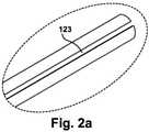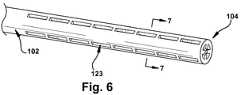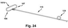 図24及び図25に示す実施形態は、例えば図5に示すような様々な断面を有する領域を有するフラットチャネルドレーンにおいて用いられる一実施形態の清掃部材107を示す。この実施形態では、ガイド部材119の末端部は、その遠位端部が長円形のループ107dを形成するように巻かれている。ループ107dは、図5に示す医療用チューブの遠位領域の周縁寸法に対応する形状であり、その内部のデブリを除去するのに有効である。これとは別に、第2の清掃部材すなわち円形の清掃部材124が、ガイド部材119に沿ってより近位に配置されて取り付けられている。清掃部材124は、図5の医療用チューブの近位領域の周縁寸法に対応する形状であり、その領域にあるデブリを除去するのに有効である。理解されるように、この実施形態では、近位の場所からガイド部材119を駆動すると、双方の清掃部材107及び124が同時に駆動され(例えば、並進、超音波振動、振動等)、したがって、その固有のそれぞれの断面をそれぞれ有する医療用チューブの長手方向に別々の2つの領域を同時に清掃する。この実施形態の清掃部材107は、断面が長円形であるシングルルーメン遠位領域用のループとして構成されているが、清掃部材107は、医療用チューブのマルチルーメン領域の清掃に関して上述した多枝部材とすることもできることに留意されたい。さらに、図24に示すループは例示的であり、図5の医療用チューブの特定の近位領域及び遠位領域に対応するが、これらのループは、清掃される特定の医療用チューブに対応するように任意の好適な形状を有することができるとともに、好適な間隔を置いて配置してもよいことを理解されたい。さらに、複数の、すなわち2つ以上の清掃部材を長手方向に別々の各領域において使用して、所与の駆動動作を用いたその領域の長さにわたる清掃を達成することができる。  The embodiments shown in FIGS. 24 and 25 show the cleaning