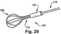 この実施形態では、長手方向に変化する主内腔112は、任意の適切なサイズの清掃部材によって清掃することができる。より最適な清掃は、医療用チューブ102の近位端部103から遠位端部114に遷移するにつれて主内腔112の断面に適応することができる清掃部材107を用いることで達成することができる。図20及び図26~図29bに示す清掃部材107は、ばね鋼又はニチノール等の形状記憶合金から作製することができ、それにより、内腔がより大きい断面からより小さい断面に遷移する領域を清掃部材107が通って進む際に、清掃部材107に側方からの圧縮力がかかることによって清掃部材が変形し、清掃部材が、内腔112のより小径の領域の断面積に対して相補的なより小さい総断面積に適合するようになる。図26及び図27の清掃部材は、ガイド部材109から又は別様には清掃部材の中心部から側方に延出して片持ち支持される分枝又はワイヤーを利用する。図28の清掃部材は、弾性の形状記憶材料製とすることができるワイヤー等の螺旋状に巻かれた部材であり、静止形態では、使用時に内腔112内で適合しなければならない最大の断面積又は直径よりも僅かに大きい。図29~図29bの清掃部材はワイヤー型清掃部材であり、この清掃部材は、ともに3次元的な全体構造を形成するように曲げられるか又は形成される、1つ又は複数のワイヤーから形成される。3次元的な全体構造とは、例えば、図29では電球又は泡立て器、図29aでは長楕円体(oblong spheroid)、図29bでは楕円体である。これらのワイヤー型清掃部材も、弾性の形状記憶材料から形成され、その静止状態では、使用時に適合しなければならない最大の断面積又は直径よりも僅かに大きい総断面積又は直径に適合するようになっていることが好ましい。各場合において、清掃部材の弾性により、主内腔112の様々な断面積若しくは直径に適合するか、又は少なくとも所与の場所において内腔内の利用可能な断面積に適応し、様々な領域の清掃を容易にすることが可能になる。例えば、上述の実施形態のいずれに係る清掃部材も、内腔112の(例えば医療用チューブ102の遠位端部における又は遠位端部付近での)より小さい断面領域に適合することができ、チューブ102を通して主内腔112のより大きい断面領域に引き込むと、清掃部材の弾性及び/又は形状記憶特性により、清掃部材がおおよそその元の形状に戻る傾向を有し、内腔112のより大径の領域に適合するより大きい総断面積を有する形態をとるようになっている。「適合する」という用語は、清掃部材の断面が内腔112の断面に必ず合致するか又は相補的であることは意味していない(一方で、これは特に内腔の断面が円形である場合の1つの可能な実施形態でもある)。むしろ、「適合する」という用語は、清掃部材の断面積が、所与の場所において内腔内の利用可能な断面積に適応するように拡張することを単に意味する。  In this embodiment, the longitudinally varying