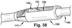 代替的な一実施形態では、上述したように医療用チューブ102が過度に伸張された場合に医療用チューブ102の仕切られた領域から清掃部材107が意図せず完全に引き抜かれることを阻止するように、伸張制限機構を組み込むことができる。図37は、図34の実施形態と同様であるがサムグリップ117に伸張抑制部126が備え付けられている一実施形態の清掃器具101を示している。サムグリップ117の遠位端部は、医療用チューブ102の外径に実質的に対応する内径を有し、それにより、締り嵌め又は任意の他の好適な取付け方式による、例えば接着剤の使用による、グリップ117及びそれに対応して抑制部126の医療用チューブ102への固定を確実にする。医療用チューブ102は、その遠位端部からサムグリップ117の伸張抑制部126内の円筒形通路を通り、ハンドルアセンブリ114へと続き、ここで医療用チューブ102はハンドルアセンブリ114に結合される。図38に示すように、抑制部126内にはリング131等の抑制要素が収容され、リング131は、リング131の中心を通って真ん中を通過する医療用チューブ102の長手軸に沿って抑制部126内を摺動するように並進可能である。リング131は、医療用チューブ102の外径に実質的に対応するか又はその外径よりも僅かでも小さい内径を有し、そのため、リング131は締り嵌めによってチューブ102の適所に固定される。代替的に又はさらに、例えば抑制要素がチューブ102を内側に受けるリングとして構成されず、その代わりにチューブ102の表面に接着されるだけである場合、接着剤も使用してもよい。リング131は、サムグリップ117の伸張抑制部内の円筒形の通路の内径に略合致する外径を有し、その内部での位置合わせ及び並進を容易にする。タブ又はスライドスイッチ132が、リング131の上部とともに形成されるか又はリング131の上部に取り付けられ、その長手軸と位置合わせして抑制部126のハウジング内に設けられたスロット130を通って延びる。医療用チューブ102又はその弾性的に伸縮可能な領域が弛緩して伸張していない場合等のその静止(非係合)位置では、抑制リング131は、抑制部126の遠位端部付近に配置され、タブ/スイッチ132は、スロット130の最遠位部に配置される。その係合位置では、抑制リング131は抑制部126の近位端部付近に配置され、タブ132は、スロット130の最近位部に到達して係合する。  An alternative embodiment is to prevent the cleaning