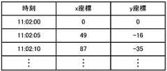 位置取得部10は、印刷装置1の位置の推移を表す位置データを取得する。位置データは、図5に示すように、一定の時間間隔における印刷装置1の位置を表すデータを含んでいる。具体的に、位置データは、時刻を表すデータと、印刷装置1の位置を表すデータと、を互いに対応付けて含んでいる。より具体的に、位置データは、印刷装置1の位置を表すデータとして、印刷装置1の電源が投入されてから画像取得ボタン103の押圧が検出されるまでの期間において最初に入力開始ボタン101の押圧が検出された時点における印刷装置1の位置を基準とする、印刷装置1の相対座標を表すデータを含んでいる。位置取得部10は、上述した移動量検出信号を含む検出信号を検出部104から取得し、当該移動量検出信号が表す印刷装置1の移動量及び移動方向に従って位置データを取得する。位置取得部10は、取得した位置データを位置データ記憶部11へ供給する。  The