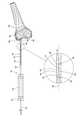 本発明のいくつかの実施形態の一態様によれば、前方先端と穴拡幅要素との間で近位対向面から近位方向に延びた突起を有し、少なくとも1つの弾性アームが、その彫削部の遠位面に遠位対向傾斜面をさらに具備しており、穴拡幅要素の軸方向移動によって、軸方向移動と幾何学的に干渉する突起と彫削部の傾斜面が係合するとともに、アームが屈曲して、彫削部が半径方向に偏向する、骨材料除去装置が提供される。 According to one aspect of some embodiments of the invention, there is a protrusion extending proximally from the proximal facing surface between the anterior tip and the hole widening element, the at least one elastic arm being carved thereof. The distal surface of the machined portion is further provided with a distal facing inclined surface, and the axial movement of the hole widening element engages the protrusion that geometrically interferes with the axial movement with the inclined surface of the machined portion. At the same time, an bone material removing device is provided in which the arm is bent and the carved portion is deflected in the radial direction.