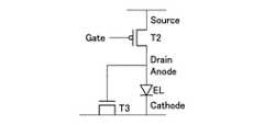 図11、12は、本開示の実施の形態に係る画素回路の回路構成を簡略化して示す説明図である。図11は、駆動トランジスタT2としてPチャネルのトランジスタを用いて、駆動トランジスタT2のドレインと、有機EL素子ELのアノードとが接続されているものである。図12は、駆動トランジスタT1としてNチャネルのトランジスタを用いて、駆動トランジスタT1のソースと、有機EL素子ELのアノードとが接続されているものである。すなわち、MOS容量T3はアノードとカソードとが同電位となっている。 11 and 12 are explanatory views showing a simplified circuit configuration of the pixel circuit according to the embodiment of the present disclosure. In FIG. 11, a P-channel transistor is used as the drive transistor T2, and the drain of the drive transistor T2 and the anode of the organic EL element EL are connected to each other. In FIG. 12, an N-channel transistor is used as the drive transistor T1, and the source of the drive transistor T1 and the anode of the organic EL element EL are connected to each other. That is, in the MOS capacitance T3, the anode and the cathode have the same potential.
