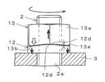 次に、上述した本発明の第2の実施例による緩み止め締結構造の緩み止め作用について説明する。図8に示すように、被締結体3を基板10にボルト部材11によって締結された状態のとき、外部から振動が加えられることにより、まず、ボルト部材11が緩み方向に回動する。これは、図6において説明したように、座金4の座面4bと被締結体3との面接合状態では広い摩擦面積F1を有しているのに対し、ボルト部材11と基板10に形成された止まり穴10aの雌ねじ部10bとの接合による摩擦面積F2が小さくなっているため、摩擦力が小さいボルト部材11が回動するためである。このとき、座金4の座面4bと被締結体3とは、摩擦力が大きいことから、不動状態が保たれている。  Next, the anti-loosening action of the anti-loosening fastening structure according to the second embodiment of the present invention described above will be described. As shown in FIG. 8, when the object to be fastened 3 is fastened to the