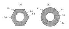 次に、本発明の緩み止め締結構造による緩み止め作用について、図5により説明する。図5(B)は、被締結体3をナット部材5により締結した状態から、振動を加えられたときの状態を示している。このように振動が加えられると、まず、ナット部材5が矢示のように回動する。すなわち、座金4の座面4bは被締結体3に面接合し、図6(B)に示すように、広い摩擦面積F1を有している。一方、ナット部材5は、斜面5e、5fと座金4の斜面4f、4gが接合することから、図6(A)に示すように、狭い摩擦面積F2となる。従って、振動を加えたときには、狭い摩擦面積F2のナット部材5が矢示の緩み方向に回動を始め、座金4は被締結体3との大きな摩擦力により不動状態が保たれる。  Next, the anti-loosening action of the anti-loosening structure of the present invention will be described with reference to FIG. FIG. 5B shows a state in which the object to be fastened 3 is fastened by the