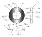 本発明に関わる緩み止め締結構造としては、ナット部材及び座金の各々の接合面に形成する高所と低所を波状に形成しても良い。すなわち、図11は、第3の実施例としての座金12を示し、中央には、ボルト部材11を挿通する透孔12aが形成され、外形は、前述したナット部材5の外径寸法と同じもしくは大きくした円盤状に形成されている。さらに、被締結体3に接合する座面12bは、軸線に対して直行する平面に形成されている。そして、座面12bとは反対の座金接合面12cは、180度対向する点対称に2個の高所12dと低所12eが形成され、この高所12cと低所12dの間は波状に形成された斜面12f、12gが形成されている。これら各々の斜面12f、12gの傾斜角度は、後述するナット部材12のリード角よりも小さい角度に形成され、前述した実施例と同様に、2個形成されている各々の斜面12f、12gの傾斜角度の総和を、リード角θ2の0.5~2倍の範囲となるようにしている。  As the anti-loosening fastening structure according to the present invention, high places and low places formed on the joint surfaces of the nut member and the washer may be formed in a wavy shape. That is, FIG. 11 shows a