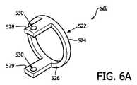[0069]  図6Aは、本開示の実施態様による冠状エレメント520の斜視図である。図6Bは、本開示の実施態様による冠状エレメント520の底面図である。図6Cは、本開示の実施態様による冠状エレメント520の線601に沿って見た側面図である。該冠状エレメント520は環状リング522並びに支持脚部又は支柱528及び529を含んでいる。該冠状エレメント520は、可撓性長尺部材108の材料とは非類似の又は非互換的材料から形成される。例えば、冠状エレメント520は、金属又はプラスチックポリマ等の熱硬化性材料から形成される。環状リング522は、上面524及び底面526を含む。支柱528及び529は、互いに、環状リング524における概ね半径方向反対側に配置されると共に、底面526から略垂直方向に延びる。支柱528及び529の各々は、該支柱528及び529の中心線に各々沿うと共に該支柱528及び529における環状リング524から遠い側の各端部に配置された孔530を有している。前記プルワイヤ507等の1対のプルワイヤを、該冠状エレメント502に支柱528及び529の各々において1つずつ固定することができる。環状リング522のエッジは、多数回の作動の間におけるプルワイヤの破損をなくすために、例えば小半径で湾曲され又は丸められる。  [0069] FIG. 6A is a perspective view of the