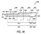 [0095]   図21は、本開示の実施態様による先端部材1700の線1803に沿う断面図である。図21は、内部空洞1800における当該先端部材1700が近端側湾曲上部外壁1730及び近端側湾曲上部内壁1828を有する箇所の収容部分1842を図示している。先端部材1700は、当該収容部分1842の内壁の一部に沿って案内部1820及び1850を形成するようにモールド成形される。案内部1820及び1850は、当該収容部分1842内で互いに半径方向の反対側に配置される。案内部1820は、第1段部1822及び第2段部1824を備えた段状の棚を含む。同様に、案内部1850は、第1段部1852及び第2段部1854を備えた段状の棚を含む。更に、先端部材1700は、当該収容部分1842に沿って長手方向に延びると共に案内部1820及び1850に結合された高めのU字状底部内壁1856を形成するようにモールド成形される。本明細書で更に詳細に説明されるように、案内部1820及び1850が前記撮像コア562(図示略)の配置を限定する。案内部1820及び1850並びに高めのU字状底部内壁1856の寸法は、異なる実施態様では異なり得る。例えば、案内部1820及び1850の寸法並びに該案内部1820及び1850の間の離隔距離は、撮像コア562を収容するように成形及び寸法決めされる。上記高めのU字状底部内壁1856の壁厚は、音響的減衰を最小化するように構成される。  [0095] FIG. 21 is a cross-sectional view taken along