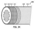 [0116]  カテーテルシャフト3100を製造する方法を、図33~図35を参照して説明する。図33は、本開示の実施態様による或る製造段階における複管路内側押出成形部3300の斜視図である。該内側押出成形部3300は、第1材料(例えば、Pebax(登録商標)72D)の高デュロメータ硬度の近端側部分3320及び第2材料(例えば、Pebax(登録商標)35D又はPebax(登録商標)45D)の低デュロメータ硬度の遠端側部分3310を含む。内側押出成形部3300は、高デュロメータ硬度近端側部分3320と低デュロメータ硬度遠端側部分3310との間に延びる主管路3331(例えば、主管路3108)及び複数の副管路3332(例えば、副管路3106)を含む。  [0116] A method of manufacturing the