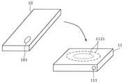 モバイル端末10は、二次電池を利用して動作する。モバイル端末10は、例えば携帯電話、スマートフォン、タブレット、PDA(Personal Digital Assistant)などであるが、これに限らない。モバイル端末10は、給電装置11に載置されることで給電装置11の送電コイル1121から送電される電力をワイヤレスで受電できる機能を有していれば、スピーカ等の電子機器であってもよい。また、モバイル端末10の形状も図1に示す平板状に限られず、球形状、円盤状などでもよい。また、図1に示すモバイル端末10は、一例として例えばLEDなどインジケータして機能する表示部101を有し、給電装置11から電力を受電中すなわちモバイル端末10の充電中に発光する等でその旨を表示する。なお、表示部101はLEDに限らない。詳細は後述する。[Mobile terminal 10]