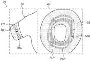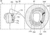 図3は、医師14がアブレーションを開始する、先端部44についての開始点を選択した後であり、かつ、アブレーションを開始する前の、表示画面36を示す。起点68L及び起点68Rは、左側ディスプレイ38及び右側ディスプレイ40におけるアブレーションの選択された開始点を、それぞれ示している。開始点が選択されると、プロセッサ30は、開始点、及び肺静脈16の既知の3D寸法に基づいて、推奨される閉じたアブレーション経路を計算する。推奨される閉じた経路が、医師14が選択した基準に基づいて計算され、この基準は、例えば、閉じた経路が肺静脈の周りの最短の経路であること、又は、閉じた経路が肺静脈の付け根から一定の距離にあること、などであってよい。推奨される閉じた経路は、領域70L及び70Rとして、左側ディスプレイ38及び右側ディスプレイ40にそれぞれ表示されている。領域70Lは、肺静脈16の周りの推奨経路に対応する画像54内の帯であり、領域70Rは、環形56内の輪である。領域70L及び70Rのそれぞれの内側には、より細い輪71L及び71Rに印が付けられ、アブレーション処置の指示において医師14を更に補助する。輪71L及び71Rは、アブレーションのための最適経路であり、領域70L及び70Rの幅は、典型的には、医師14が輪71L及び71Rから、ずらしたいと考える最大距離に基づいて、医師14によって設定される。推奨アブレーション経路は、アブレーション処置が完了したときに、心拍活動の波がブロックされるような、肺静脈16の周りの閉じた経路である。  FIG. 3 shows the