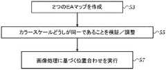 工程57では、公知の画像処理技術を用い、2つのマップをカラースケールに従って位置合わせする。そのような方法の多くは、例えば、空間又は周波数強度パターン、構造的特徴部、及び様々な類似度の測定に基づいており、当該技術分野において公知である。  In