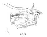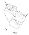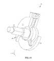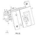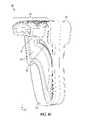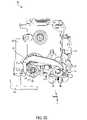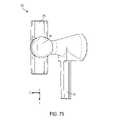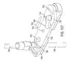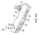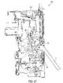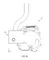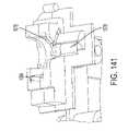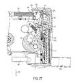 すなわち、キャリッジ150から離れるリフト156の作動により、キャリッジ150が自由に回転することができるように歯止め154が作動する。歯止め154は、リフト156から持ち上げられると、図35に示すようにキャリッジ150の切欠き268と係合することができず、したがって、キャリッジ150は自由に回転することができる。歯止め154が、キャリッジ150の図34に示すような切欠き268と係合すると、キャリッジ150は、図36に示す位置まで回転することができない。レバー104が閉鎖されているとき、キャリッジ150は、図34及び図35において右回り矢印として示す方向608において、図36に示す位置まで回転することができる。図36は、図35と同じ断面図であるが、キャリッジ150がレバー104の閉鎖によってもたらされる回転位置にある断面図を示す。  That is, the actuation of the