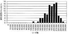 ここで、インデックス配列を設計するにあたり、閾値とする推定リード数は、特に限定されず、目的とするデータ解析に応じて適宜設定することができる。例えば、推定リード数の閾値として15000~25000の値を設定することができ、17000~23000の値を設定することが好ましく、19000~21000の値を設定することがより好ましく、19500~20500の値を設定することが更に好ましい。詳細を後述する実施例に示すように、インデックス配列の塩基配列に関して、リード数が著しく低い一群の塩基配列が同定されている。この一群の塩基配列について推定リード数を計算したところ、最大でリード数が20000程度、具体的には20051.8であることが判明している。したがって、上述した閾値を20000程度、例えば20052とすることで、実際に多くのリード数を得ることができるインデックス配列を設計することができる。 Here, in designing the index array, the estimated number of reads as a threshold value is not particularly limited and can be appropriately set according to the target data analysis. For example, a value of 15000 to 25000 can be set as a threshold value for the estimated number of reads, a value of 17000 to 23000 is preferable, a value of 19000 to 21000 is more preferable, and a value of 19500 to 20500 is set. Is more preferable. As shown in Examples described in detail later, a group of base sequences having a significantly low number of reads has been identified with respect to the base sequence of the index sequence. When the estimated number of reads was calculated for this group of base sequences, it was found that the maximum number of reads was about 20000, specifically 20051.8. Therefore, by setting the above-mentioned threshold value to about 20000, for example, 20052, it is possible to design an index array that can actually obtain a large number of reads.