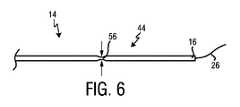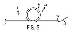 具体的には、図3ないし5は、医療デバイス14を特定の形状へ変形させたものである特定の操作の形態を示す。図3は医療デバイス14に適用されたS字形状50を示す。図4は医療デバイス14に適用される半円52を示す。図5は医療デバイス14に適用される完全なループ54を示す。S字50、半円52及び/又は全ループ形状54は、平面内にある又は平面内にはないものとすることが可能であり、ここで、例えばその平面は図面の紙面である。  Specifically, FIGS. 3 to 5 show a specific form of operation in which the