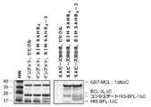 アポトーシス促進性メンバーおよび抗アポトーシス性メンバーの両方を含むBCL-2タンパク質ファミリーは、細胞運命を指示するチェックおよびバランスの複雑なネットワークを形成する。当該ファミリーは、4つまでの保存「BCL-2ホモロジー」(BH)ドメインの存在によって構造的に定義され、これらは全て、αヘリックス部分を含む。Bfl-1およびMCL-1などの抗アポトーシス性タンパク質は、全BHドメインにおいて配列保存を呈するが、アポトーシス促進性タンパク質は、「マルチBHドメイン」メンバー(例えば、BAXおよびBAK)と、αヘリックスBH3ドメインにおいてのみ配列類似性を呈する「BH3オンリー」メンバー(例えば、BIMおよびNOXA)とに分けられる。当該BH3オンリーサブグループは、多様であり、異質な刺激からの死誘発性シグナル(pro-death signal)をミトコンドリアに位置するアポトーシス機構に伝達する。当該BH3オンリータンパク質の死シグナルは、抗アポトーシス性タンパク質によって中和されるか、または直接もしくは間接的にミトコンドリア・エクセキューショナー(mitochondrial executioner)、BAXおよびBAKに送達される。活性化されると、BAX/BAKは、ミトコンドリア外膜透過処理を誘導し、放出されたミトコンドリア因子が、死のプログラムを不可逆的に実行するカスパーゼを誘導することを可能にする。 The BCL-2 protein family, which includes both pro-apoptotic and anti-apoptotic members, forms a complex network of checks and balances that direct cell fate. The family is structurally defined by the presence of up to four conserved "BCL-2 homology" (BH) domains, all of which contain an alpha helix moiety. Anti-apoptotic proteins such as Bfl-1 and MCL-1 exhibit sequence conservation in all BH domains, whereas pro-apoptotic proteins are "multi-BH domain" members (eg, BAX and BAK) and the α-helix BH3 domain. It is divided into "BH3 only" members (eg, BIM and NOXA) that exhibit sequence similarity only in. The BH3 only subgroup is diverse and transmits pro-death signals from heterogeneous stimuli to the apoptotic mechanism located in mitochondria. The death signal of the BH3 only protein is neutralized by the anti-apoptotic protein or delivered directly or indirectly to the mitochondrial executioner, BAX and BAK. When activated, BAX / BAK induces mitochondrial outer membrane permeabilization and allows released mitochondrial factors to induce caspases that irreversibly carry out the program of death.