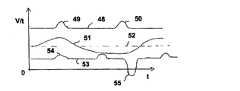 曲線53に示される第三のバリエーションにおいて、流速の一時的な周期的上昇54のほかに、流れの方向もまた逆転され、これは流速の低下55の例に基づいて示されている。流れの逆転によって、導管8の中の液体の流れの方向を変化させ、したがって、同様によどみ部分の液体を交換させる。このような流れ方向の逆転は、例えば5~10分間隔で発生させることができる。  In the third variation shown in