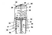 図2において、仕切り壁17を破線で示し、導管8の第一の導管領域8aと第二の導管領域/戻り導管8bとの間の分離を示している。それゆえ、第一の導管領域8aを通って矢印34の方向に中空カテーテル1の遠位端へと向かう液体の流入と、導管8の第二の領域8bを通る矢印35の方向へと戻る流れが可能となる。ロータリシャフト2にはこのようにして、その長さ全体に沿って液体を供給できる。  In FIG. 2, the
