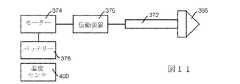 駆動部342は、米国特許第6,656,158号、第6,656,159号、第7,128,727号、第7,144,384号に見られるシリンダのプランジャを動かす装置と構造と動作が類似したものであってもよい。これらの特許は、全ての目的上、参照により本明細書に組み入れられる。図11に示すように、駆動部342はプランジャアーム372、モータ374、伝動装置376、バッテリ378を含むようにしてもよい。プランジャアーム372はプランジャ366と少なくとも第1端で接触し、プランジャ366をシリンダ360に沿って押す。伝動装置376はプランジャアーム366とモータ374に組み合わされ、プランジャアーム372をモータ374の動作に応じて動かす。バッテリ378はモータ374のための電力源となる。モータ374、伝動装置376、バッテリ378の組み合わせもまたアクチュエータの一例と言うことができる。  The