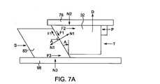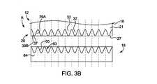 図1Bを再び参照すると、各係合部材32は、長手方向軸15に沿って、係合部材32の近位端部37からシリンジ12の終端部27に向けて遠位方向に延在する一対のテーパ面39A~39Bを備えた略尖った近位端部37を有していてもよい。近位端部37は、尖ったまたは丸い点を有してもよい。テーパ面39A~39Bの少なくとも1つは、長手方向軸15の方向に対して角度Bで軸方向および/または周方向に角度をなしていてもよい(図1Bに示す)。長手方向軸15に対する少なくとも1つのテーパ面39A~39Bの軸方向/周方向の先細りは、シリンジバレル18の遠位端部24から近位端部20に向かう方向に、円筒形の平面投影図において少なくとも1つのテーパ面39A~39Bの傾斜角として画定されてもよい。テーパ面39A~39Bは、長手方向軸15に対して同じまたは異なる角度で角度をなしていてもよい。幾つかの実施形態では、テーパ面39A~39Bは、直線状、曲線状、またはそれらの組み合わせであってもよい。他の実施形態では、テーパ面39A~39Bの内の片方の断面は、テーパ面39A~39Bの他方のものと同じであっても異なっていてもよい。例えば、テーパ面39A~39Bの内の片方は、長手方向軸15の方向に対して角度をなしていてもよく、一方、テーパ面39A~39Bの他方は、長手方向軸15の方向と平行であってもよい。少なくとも2つの係合部材32が互いに隣接して配置される実施形態では、1つの係合部材32のテーパ面39Aは、隣接する各係合部材32のテーパ面39Bに移行してもよい。  Referring again to FIG. 1B, each engaging