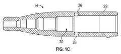 いくつかの実施形態では、カテーテルアダプタ14は、たとえば図1Cに示すような、第1のストッパ穴26および第2のストッパ穴26を含むことができる。いくつかの実施形態では、第1のストッパ穴26および第2のストッパ穴26は、対向しており、カテーテルアダプタ14の両側に配設され得る。しかし、カテーテル組立体16は、任意の数のセプタムストッパ10および対応するストッパ穴26を含むことができる。たとえば、カテーテルアダプタ14は、3つまたは4つのストッパ穴26およびセプタムストッパ10を含むことができる。いくつかの実施形態では、ストッパ穴26をカテーテルアダプタ14の周囲に離間して置くことができ、および/または単一の環状溝24と位置合わせすることもできる。いくつかの実施形態では、ストッパ穴26は、セプタム12の周りの任意の場所に配設され得る。  In some embodiments, the