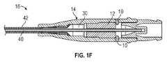 いくつかの実施形態では、セプタムストッパ10のそれぞれは、曲線状の上部表面22を含むことができる。たとえば、セプタムストッパ10のそれぞれは、凸状または凹状の上部表面22を含むことができる。いくつかの実施形態では、曲線状の上部表面22は、カテーテルアダプタ14の外側表面の湾曲に合致することができ、それにより、カテーテルアダプタ15の外側表面とセプタムストッパ10のそれぞれとの間に円滑な移行が存在する。図1D~1Eは、挿入構成にあるカテーテル組立体16を示し、ここでは導入針40が、カテーテルアダプタ14を通り、カテーテル42の遠位端部を超えて延びている。  In some embodiments, each of the