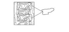 続いて、処理回路1113は、透視画像上に形状画像を重畳させる位置を決定する。形状画像を重畳させる位置は、例えば、術者により透視画像上の位置が指定されることで決定される。また、例えば、既存のパターンマッチング処理により、形状画像の一部と、透視画像の一部とが対応付けられることで決定される。形状画像の表示形式は、操作者からの指示に従い、任意に決定可能である。例えば、椎体領域の境界線のみを表示してもよいし、不透明度を下げて透視画像を視認可能かつ、重畳する椎体領域全体を視認可能に表示してもよい。処理回路1113は、形状画像を、透視画像上の決定された位置に重畳させる。図11は、透視画像における治療対象である椎体上に、好適状態の椎体の形状画像を重畳させた際の表示例を表す模式図である。  Subsequently, theprocessing circuit 1113 determines a position on which the shape image is superimposed on the fluoroscopic image. The position on which the shape image is superimposed is determined, for example, by the operator designating the position on the fluoroscopic image. Further, for example, it is determined by associating a part of the shape image with a part of the fluoroscopic image by an existing pattern matching process. The display format of the shape image can be arbitrarily determined according to the instruction from the operator. For example, only the boundary line of the vertebral body region may be displayed, or the opacity may be lowered so that the fluoroscopic image can be visually recognized, and the entire superposed vertebral body region may be visually displayed. Theprocessing circuit 1113 superimposes the shape image on the determined position on the fluoroscopic image. FIG. 11 is a schematic view showing a display example when a shape image of a vertebral body in a suitable state is superimposed on a vertebral body to be treated in a fluoroscopic image.