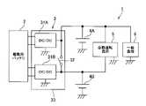 近年、ハイブリッド車や電気自動車においては、駆動モータ用の高圧バッテリ(駆動電源)と、該高圧バッテリからの出力を駆動モータ以外の各種電装品に対応する電圧に変換するDC/D変換器と、を備えるものが提案されている。 In recent years, in hybrid vehicles and electric vehicles, high-pressure batteries (drive power supplies) for drive motors and DC / D converters that convert the output from the high-pressure batteries into voltages corresponding to various electrical components other than drive motors. Those equipped with are proposed.