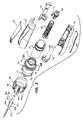 前ノブ部74は、その遠位端に先端部分78、並びに、前端又は近位端に中央本体部75及びカラーフランジ76を含み、カラーフランジは、ハウジング部22、24内のノッチ内に着座している。(例えば、より可撓性のプラスチック又はゴムのオーバーモールドの)ノブ部80は、ユニットを把持及び操作するためのより可撓性で優れた把持面を提供するように、前ノブ部74の中央部分75の周りに、かつ先端部分78を覆って、配置される。ノブ部80は、把持リブ84と、位置ボタン又は親指マーカ82と、前ノブ部74の先端部分78を包囲する先端部86と、を含む。  The