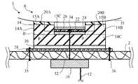 このようなゴム電極部14は、例えば、ゴム電極部14全体の形状に対応する内部空間を有する型を用いて、プレス成形または射出成形によって、形成してもよい。あるいは、1つの広い部品14Cに一対の部品14A,14Bを重ねて、ゴム電極部14を形成してもよい。図2において、符号Bで特定される仮想線は、部品14Cの一面、すなわち部品14A,14Bに対する境界面を示す。  Such a