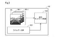 図3に示すように、操舵識別部42は、識別ネットワーク構造422と、ラベルデータ群423とを有する。識別ネットワーク構造422は、LRCN(Long Recurrent Conventional Network)を用いて構成されている。ラベルデータ群423は、過去に収集した進行方向ごとの複数の撮像画像IMと、撮像画像IMごとに操舵パターンを区分したデータである。つまりラベルデータ群423は、撮像画像IMを解析し、自動運転車1の進行方向に障害物があるか否かの状況に応じて操舵パターンを区分したデータである。例えば、自動運転車1の進行方向側に停車中の他車両が位置する撮像画像IMには、操舵パターンとして回避操舵パターンが紐付けられている。また例えば、自動運転車1の進行方向側に停車中の他車両が位置しない撮像画像IMには、操舵パターンとして通常操舵パターンが紐付けられている。  As shown in FIG. 3, the