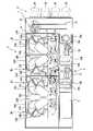 一態様では、前記2つの内側壁の外面と前記2つの外側壁の内面との間にはそれぞれ隙間が形成されており、前記内保護壁の外面と前記外保護壁の内面との間には隙間が形成されており、前記2つの内側壁および前記内保護壁のそれぞれの上端と前記天井壁の下面との間には隙間が形成されている。In one aspect, the lower end of the outer wall structure is higher than the lower end of the inner wall structure, and the upper end of the outer wall structure is higher than the upper end of the inner wall structure.
