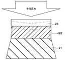 まず、図5Aを参照し、下側弾性部材J22が上記下側弾性部材22と異なる材料、例えば、アスカ-C硬度が50程度であるウレタンゴムで構成されている場合について説明する。このような下側弾性部材J22を用いた場合、第1センサ部20の積層方向に生体圧力が印加されると、構造体21のアスカ-C硬度が高いため、図5A中の点線で示されるように、下側弾性部材J22は、第1圧電素子23側の面が全体的に下方に変位すると共に、側面が外側に膨らむように変形する。この際、第1圧電素子23は、下側弾性部材J22が全体的に下方に変位するため、下側弾性部材J22の変位に伴って下方に変位するものの、下側弾性部材J22の変位に起因する変形が少ない。このため、第1圧電素子23は、第1圧電素子23自体に印加された生体圧力に応じた信号を出力する。  First, with reference to FIG. 5A, a case where the lower elastic member J22 is made of a material different from the lower