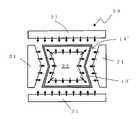 つぎに図7を参照しながらくせ折りされた開口頂端部14’の頂部熱融着部12の内面及び外面が同時に加熱される状態について説明する。図7に示すように加熱装置本体(図示しない)は、外面加熱部21と内面加熱部22が設けられたチャンバー部20を備えており、チャンバー部20がくせ折りされた開口頂端部14’に覆い被さるように下降して加熱し、加熱後、上昇してくせ折りされた開口頂端部14’より離脱するという動作をするものである。加熱に際し、下降したチャンバー部20は液体用紙容器のくせ折りされた開口頂端部14’に覆い被さり、くせ折りされた開口頂端部14’の内面及び外面は、内面加熱部22及び外面加熱部21により内外から囲まれた状態となり、装置本体内の熱風供給部より供給される所定温度に加熱された空気を外面加熱部21及び内面加熱部22の多数の熱風噴射小孔(図示しない)より図7に太線の矢印で示す如く、くせ折りされた開口頂端部14’の接着すべき頂部熱融着部12に向けて熱風を噴射するように構成されており、頂部熱融着部12の内面の熱融着性樹脂層160及び外面の熱可塑性樹脂層110が同時に加熱溶融される。加熱後、チャンバー部20を備えた装置本体は上昇し、くせ折りされた開口頂端部14’より離脱する。次に頂部加圧装置(図示しない)で圧着接合され頂部熱融着部12を形成することにより、図1に示すゲーブルトップ型の液体用紙容器10が完成する。頂部熱融着部12を圧着接合するために通常300℃以上の高温熱風が頂部熱融着部12を含む部分に吹き付けられる。このとき、熱風温度が高温になるほど、バブリングが発生しやすくなる。したがって、熱融着性樹脂層160に環状オレフィン共重合体が含まれていると従来の低密度ポリエチレンに比べ熱融着温度を高くしなければならず、バブリングの発生防止策が必要になる。  Next, a state in which the inner surface and the outer surface of the top heat-sealing portion 12 of the bent-folded opening top end portion 14'are simultaneously heated will be described with reference to FIG. 7. As shown in FIG. 7, the heating device main body (not shown) includes a