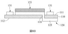 本発明の第一感知部分121及び第二感知部分131の構成は、第一から第三実施形態に記載されているが、他の構成もあり得る。例えば、第一実施形態において、第二感知部分131は、第一感知部分121の互いに接続された三つの側に沿って延在し、U字型の感知部分を形成する。しかしながら、変更された実施形態において、第二感知部分131の長さは、図6(A)に示すように、第一感知部分121の三つの側に沿って延びるように調整でき、或いは、第二感知部分131は、図6(B)に示すように、L字形の感知部分を形成するように、第一感知部分121の二つの隣接する側に沿って延びる。第一実施形態の別の変更された実施形態において、第一作用電極120の第一信号接続部分123は、基板110の貫通穴118を介して基板110の反対側の表面112に配置と延長され得る。したがって、第二感知部分131は、図6(C)~6(D)に示すように、第一感知部分121の四つの側を囲むことができる。第二実施形態であろうと第三実施形態であろうと、第二感知部分131の長さは、図7~8(C)に示すように変更され得る。したがって、前述の「第二感知部分131は、第一感知部分121の少なくとも一方の側に隣接する」という句は、具体的には、第一感知部分121の周辺の全体に対する、第二感知部分131に隣接する第一感知部分121の周辺部分の比率は、30%~100%の範囲であることを指す。The configurations of the